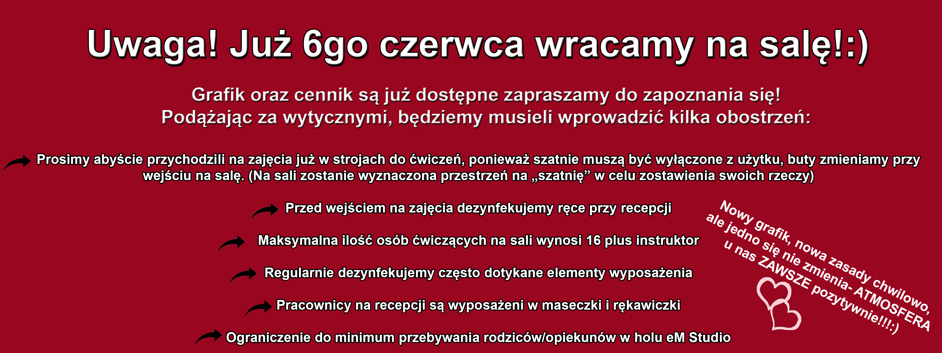 Z uwagi na obecną sytuację związaną z coronavirusem musieliśmy zawiesić zajęcia stacjonarne. Na bieżąco monitorowaliśmy sytuację i możemy Was poinformować, że już od 6go czerwca wracamy na salę!:) Oczywiście zachowując wszelkie środki ostrożności oraz stosując się do zaleceń. Tymczasem zapraszamy na kolejny tydzień naszych zajęć tanecznych ONLINE! Szczegóły i grafik z zakładce eM Studio ONLINE:)