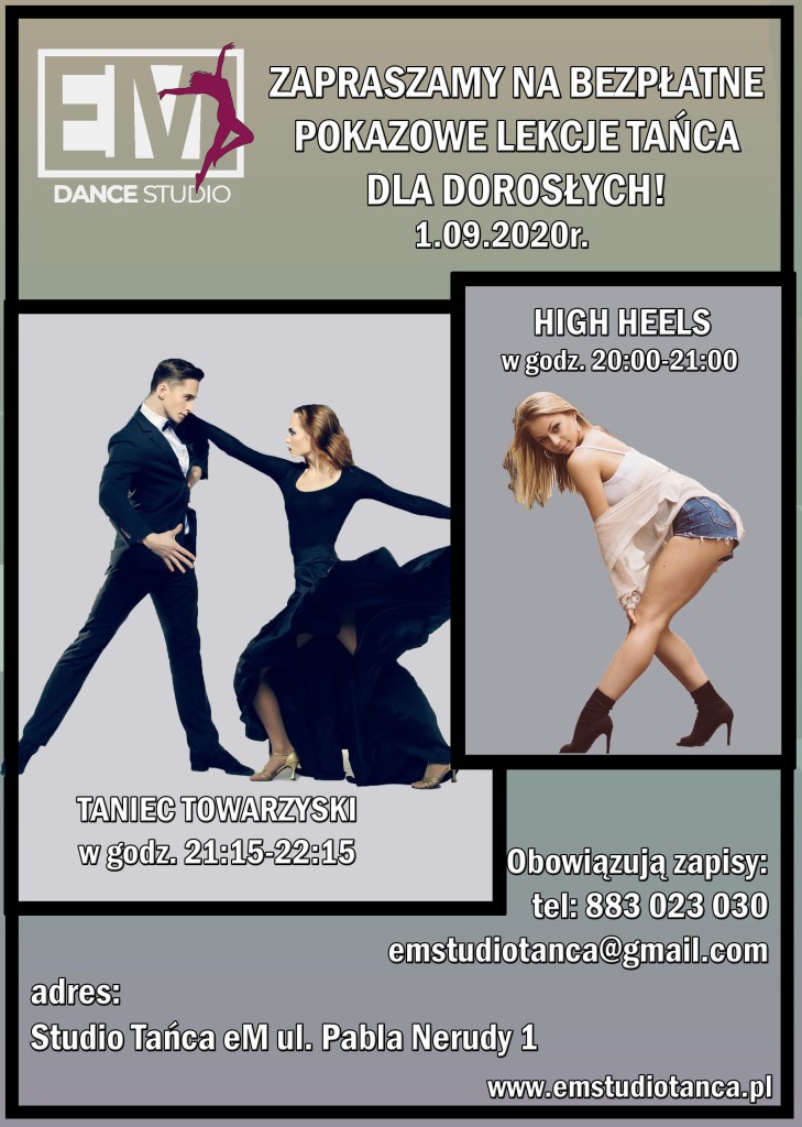 Darmowe zajęcia pokazowe z tańca dla dorosłych! Taniec towarzyski i High Heels, zapraszamy serdecznie 1.09. zajęcia prowadzi Justyna Barycka najlepsza w swoim fachu! Opublikowane przezemstudiotanca26 sierpnia 2020Opublikowany wBez kategorii Udostępnij: Udostępnij na X (Otwiera się w nowym oknie) X Udostępnij w serwisie Facebook (Otwiera się w nowym oknie) Facebook Lubię Wczytywanie… Powiązane