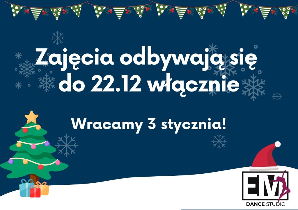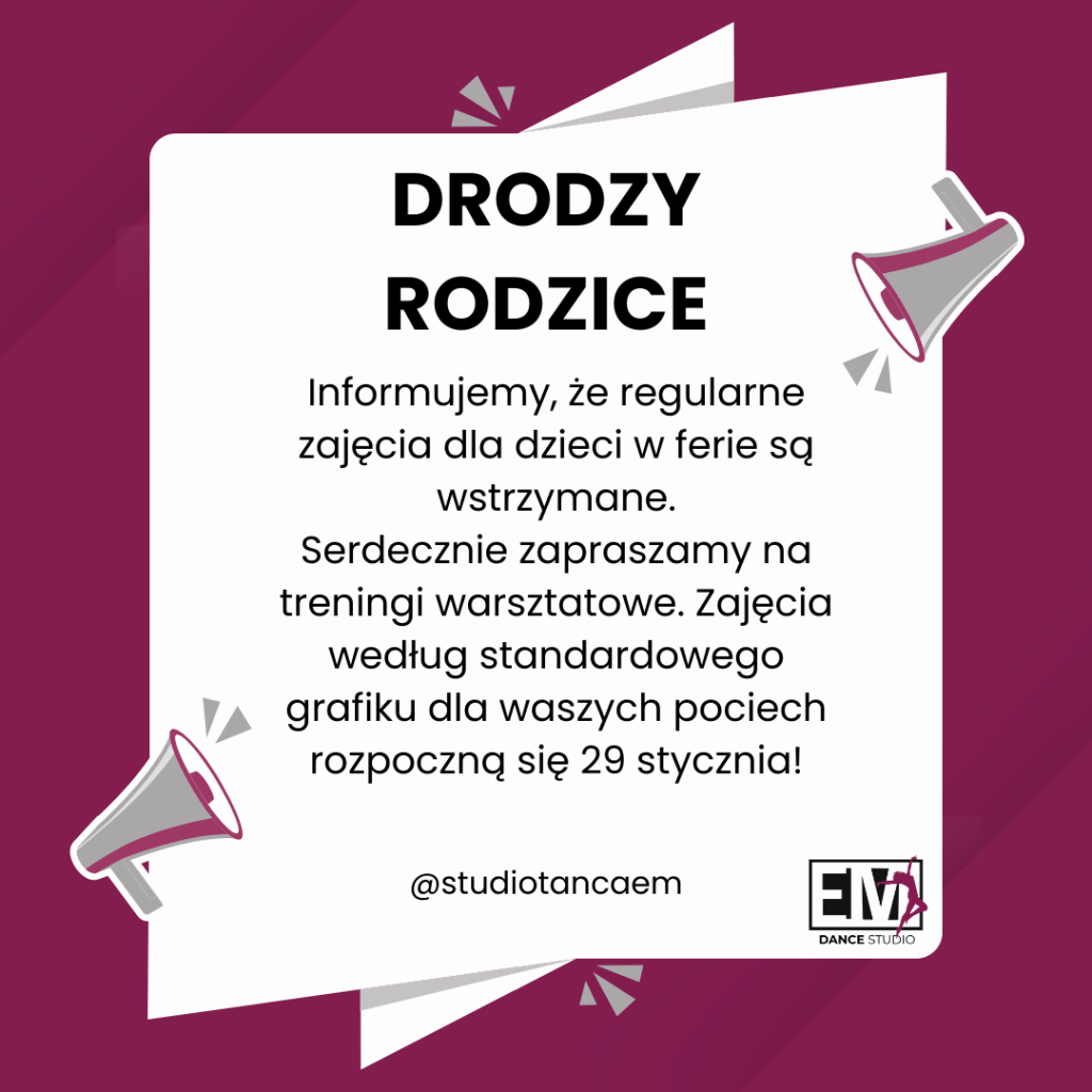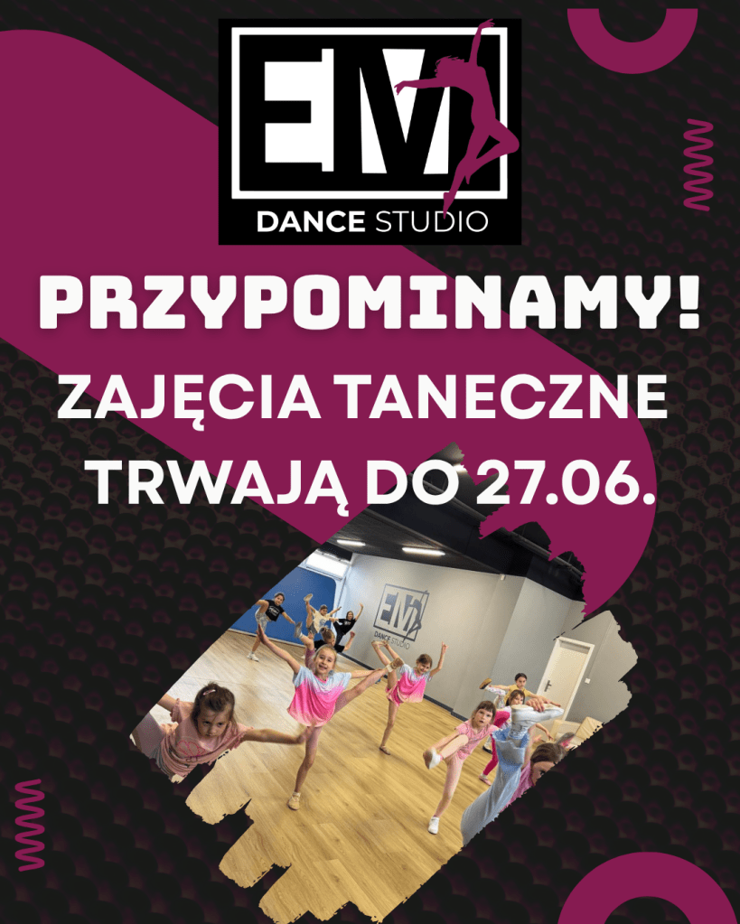 Informujemy, że zajęcia w Studio Tańca eM ODBYWAJĄ SIĘ bez zmian, według aktualnego planu zajęć. Dokonamy wszelkich starań, żeby każdy czuł się u nas bezpiecznie! Prosimy o przestrzeganie naszego regulaminu oraz obostrzeń panujących w naszym obiekcie.