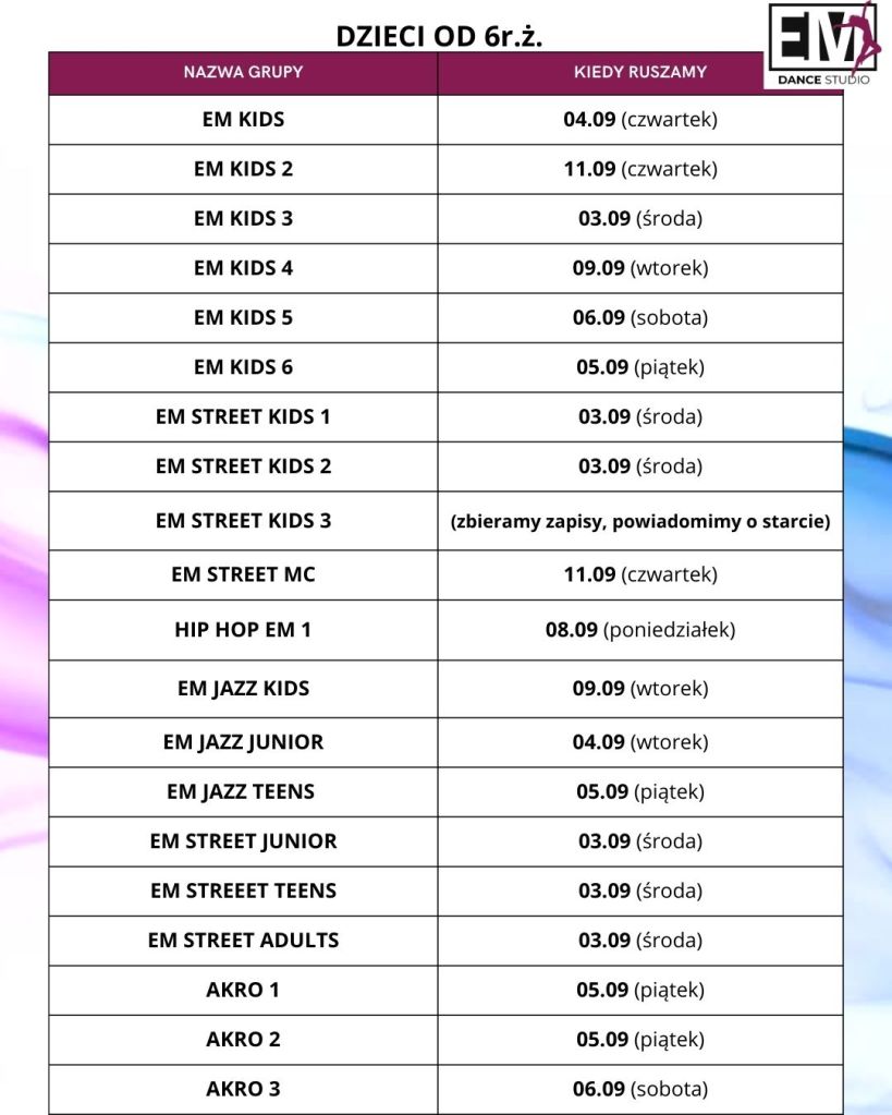 Poniżej znajdziecie szczegółowe informacje dotyczące terminów rozpoczęcia zajęć dla poszczególnych grup. Prosimy o uważne zapoznanie się z harmonogramem, aby każdy mógł odpowiednio przygotować się do startu zajęć.