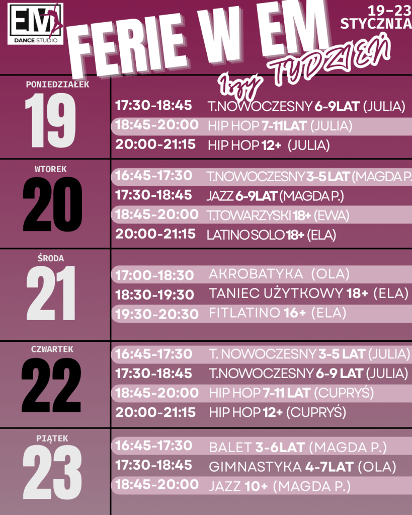 ZAPRASZAMY DO ZAPOZNANIA SIĘ Z ROZKŁADEM WARSZTATOWYCH ZAJĘĆ TANECZNYCH W FERIE ZIMOWE:
