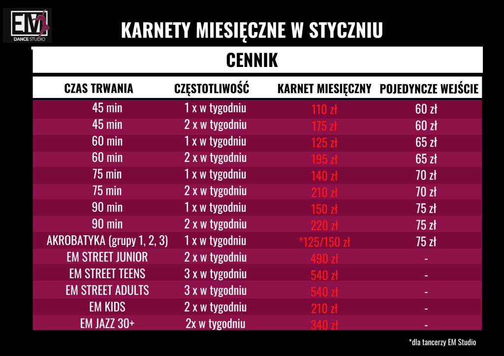 Styczeń jest wyjątkiem ujętym w regulaminie, pozostałe miesiące mają stały karnet. Ceny dla grup turniejowych (EM Street Junior, MC, Teens i Adults) zawierają już opłatę za szkolenie