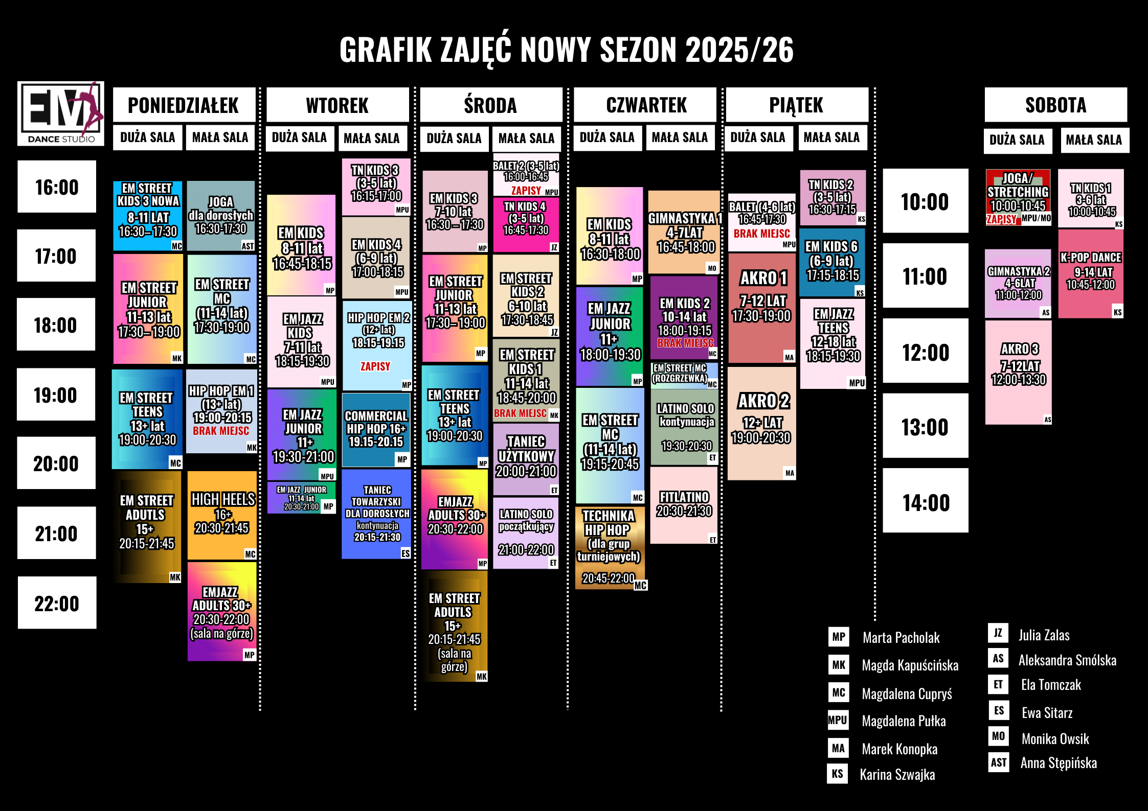 GRAFIK ZAJĘĆ EM STUDIO OD WRZEŚNIA 2025 DO CZERWCA 2026 WŁĄCZNIE.