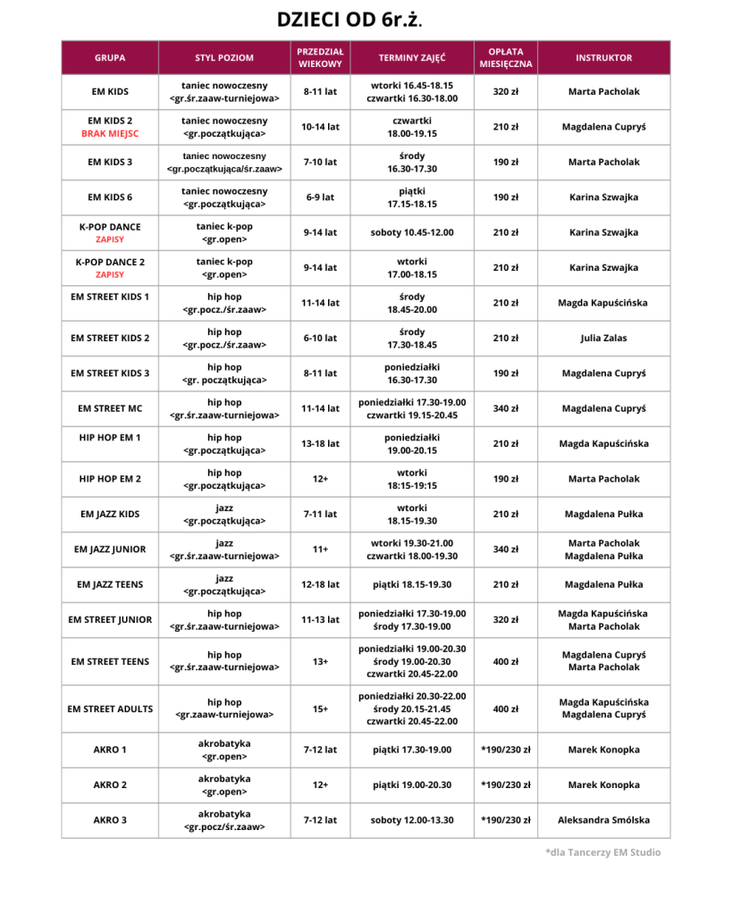 TANIEC DLA DZIECI I MŁODZIEŻY (JUNIORZY) 7-15 LAT Przed rozpoczęciem kursu tańca prosimy o zapoznanie się z Regulaminem Studia Tańca eM. Udostępnij: Udostępnij na X (Otwiera się w nowym oknie) X Udostępnij w serwisie Facebook (Otwiera się w nowym oknie) Facebook Lubię Wczytywanie…