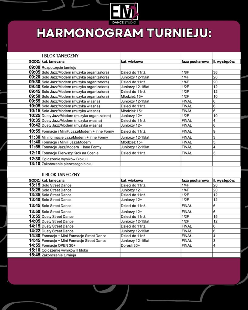 Harmonogram Turnieju będzie podany na profilu Facebook Turnieju Tańca Nowoczesnego do 03.02.2026, do godz. 24:00.